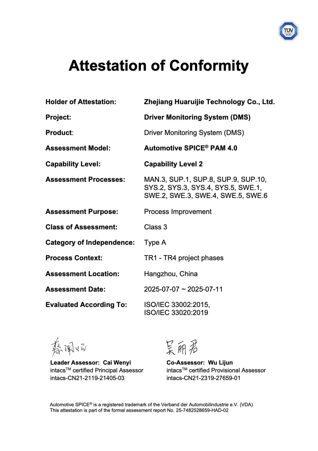 ASPICE是国际公认的汽车软件研发流程评估标准,旨在全面指导汽车软件开发的各个阶段,明确质量要求。本次通过ASPICE L2认证的项目属于华锐捷智能座舱领域,依托计算机视觉与人工智能技术的深度融合,构建起涵盖驾驶员监测系统(DMS)、乘员监测系统(OMS)及生命体征监测(CPD)全维度座舱感知体系,广泛应用于安全驾驶保障与人机交互等核心场景。